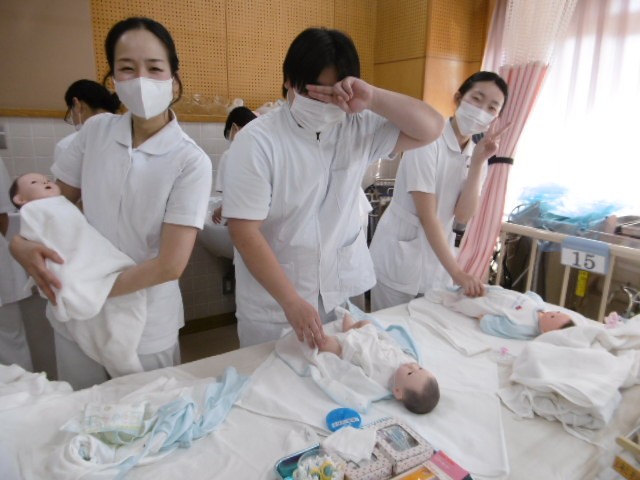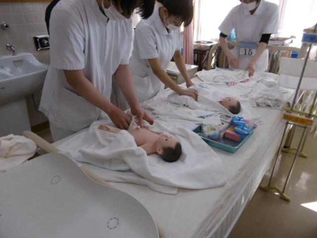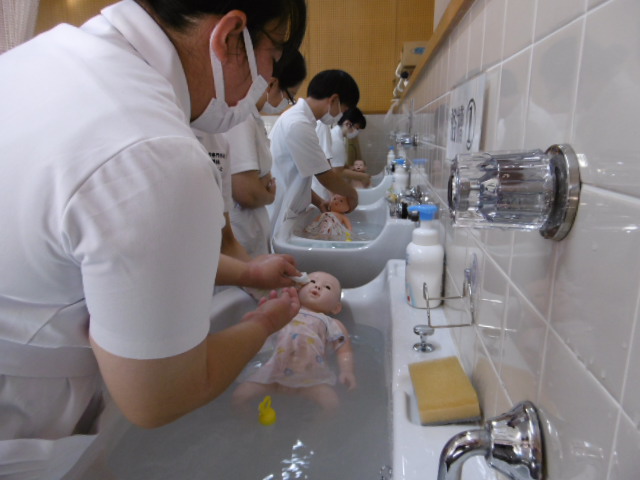 准看護科43回生 母性演習の様子。学生の皆さん、沐浴に一生懸命です。